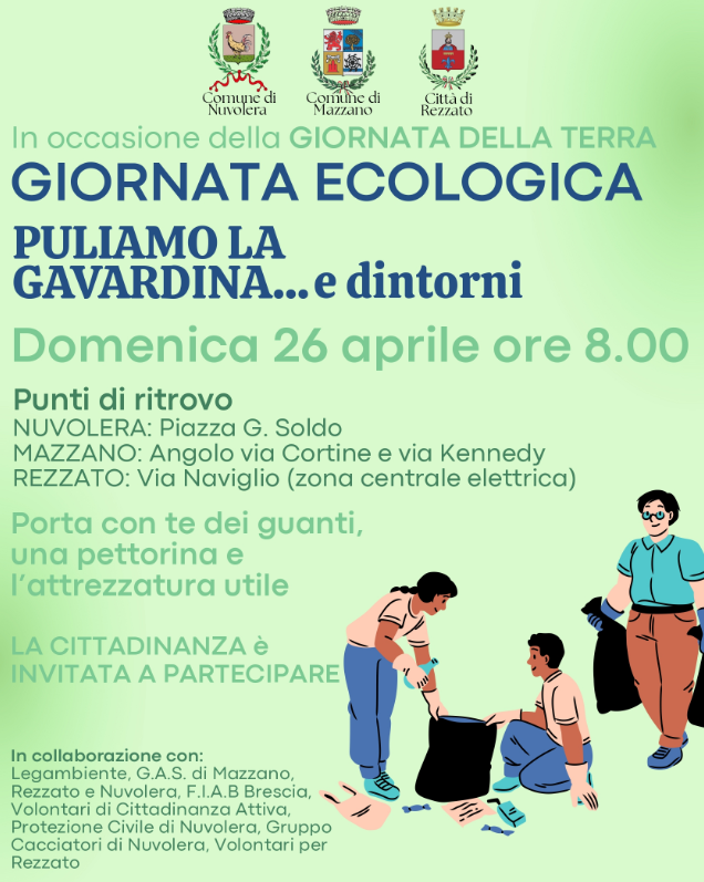 In occasione della Giornata della Terra, domenica 26 aprile 2026 alle ore 8.00, i Comuni di Mazzano, Nuvolera e Rezzato promuovono insieme una giornata ecologica di pulizia del territorio, invitando tutta la cittadinanza a partecipare. L'iniziativa, intitolata "Puliamo la...