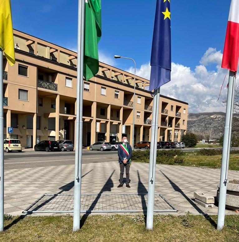 Alle 11 il Sindaco Zotti si è presentato davanti al nostro municipio indossando la fascia tricolore, per osservare un minuto di silenzio al cospetto della bandiera italiana esposta a mezz'asta.