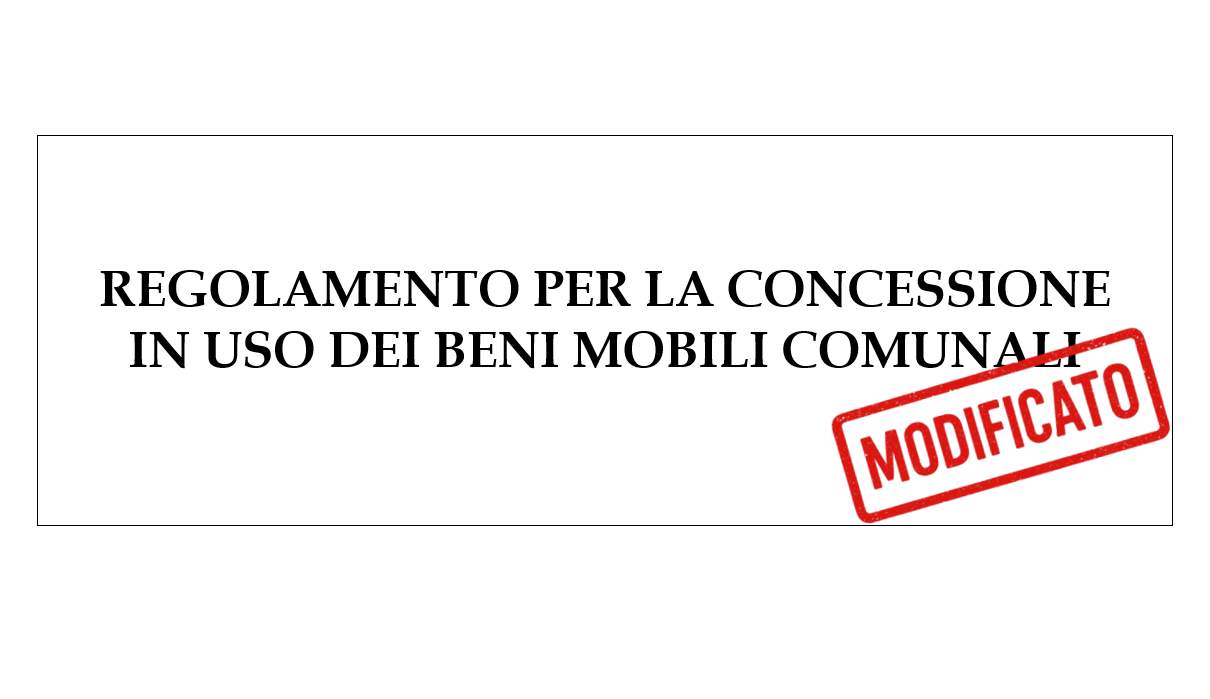 Si comunica che, a seguito dell’esecutività della Deliberazione del Consiglio Comunale n. 54 del 29 settembre 2025, il Regolamento per la concessione in uso dei beni mobili comunali, approvato con Deliberazione del Consiglio Comunale n. 12/2019, con Deliberazione della Giunta Comunale n. 50/2019, e successivamente modificato con Deliberazione del Consiglio Comunale n. 29/2021, è stato ulteriormente modificato.