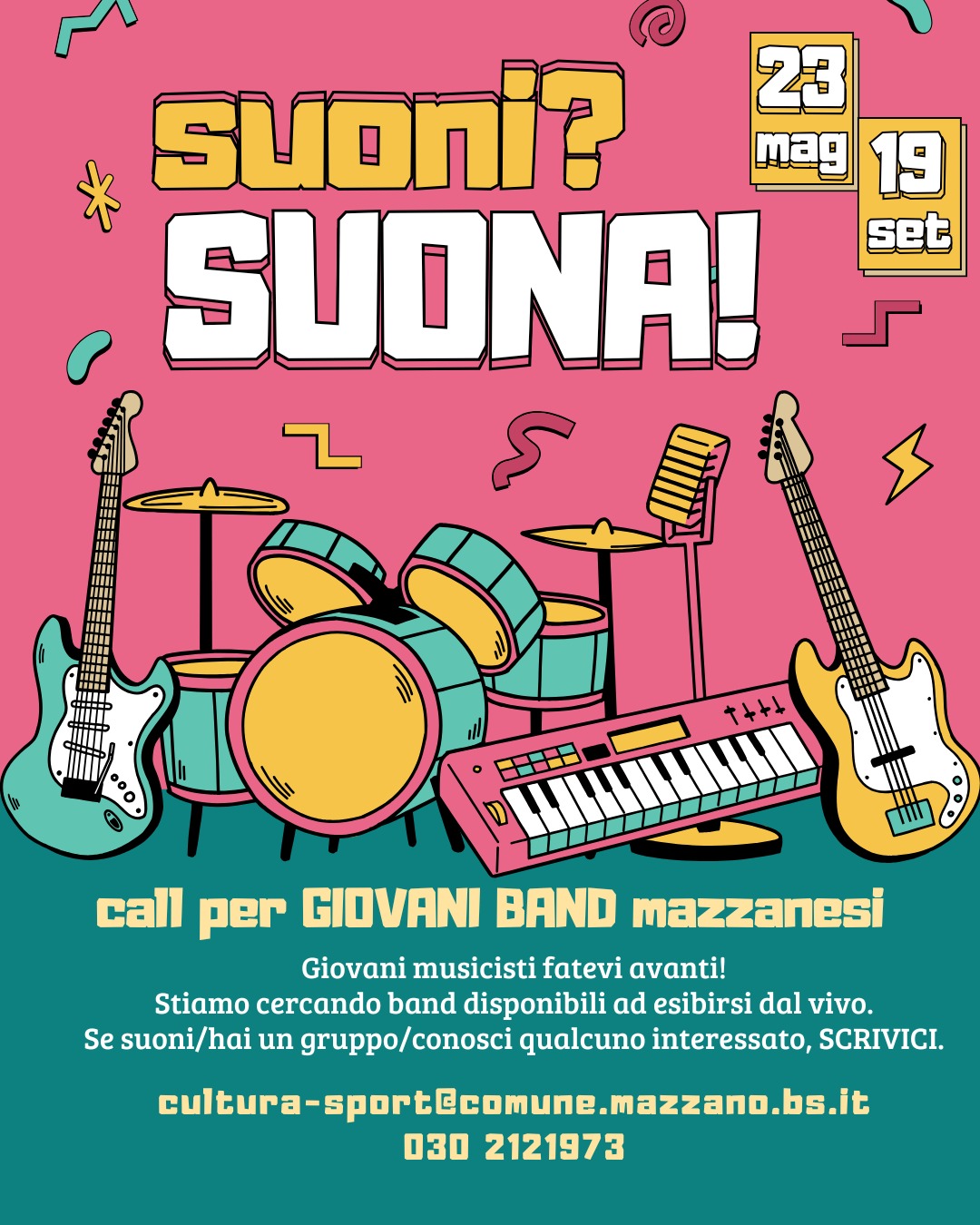 Nota: Se suoni in un gruppo o conosci realtà musicali del nostro Comune, non esitare a scriverci o a segnalare questa opportunità!